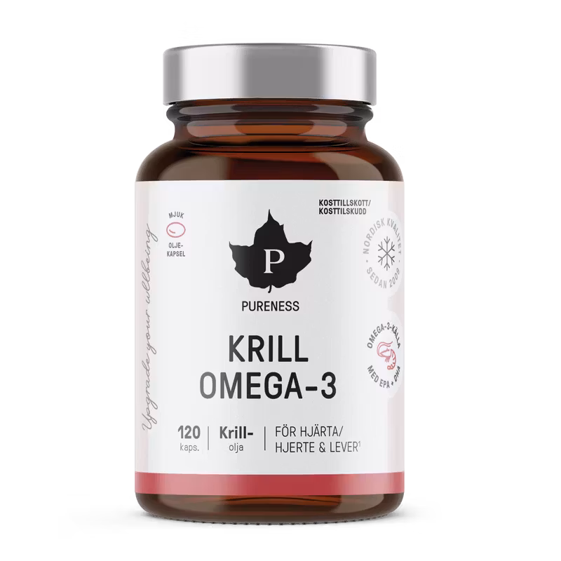 Pureness Krill Omega-3 bidrar till normal funktion av hjärta, lever och fettmetabolism. Dess fosfolipidform har visat sig förbättra absorptionen av EPA- och DHA-fettsyror, som bidrar till hjärtats normala funktion. Den gynnsamma effekten uppnås vid ett dagligt