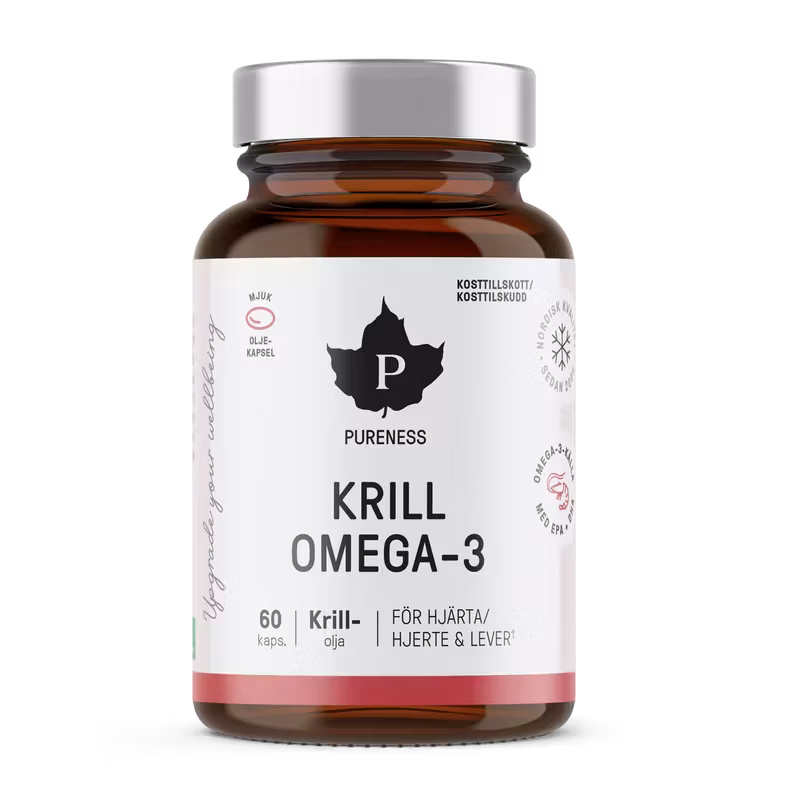 Pureness Krill Omega-3 bidrar till normal funktion av hjärta, lever och fettmetabolism. Dess fosfolipidform har visat sig förbättra absorptionen av EPA- och DHA-fettsyror, som bidrar till hjärtats normala funktion. Den gynnsamma effekten uppnås vid ett dagligt