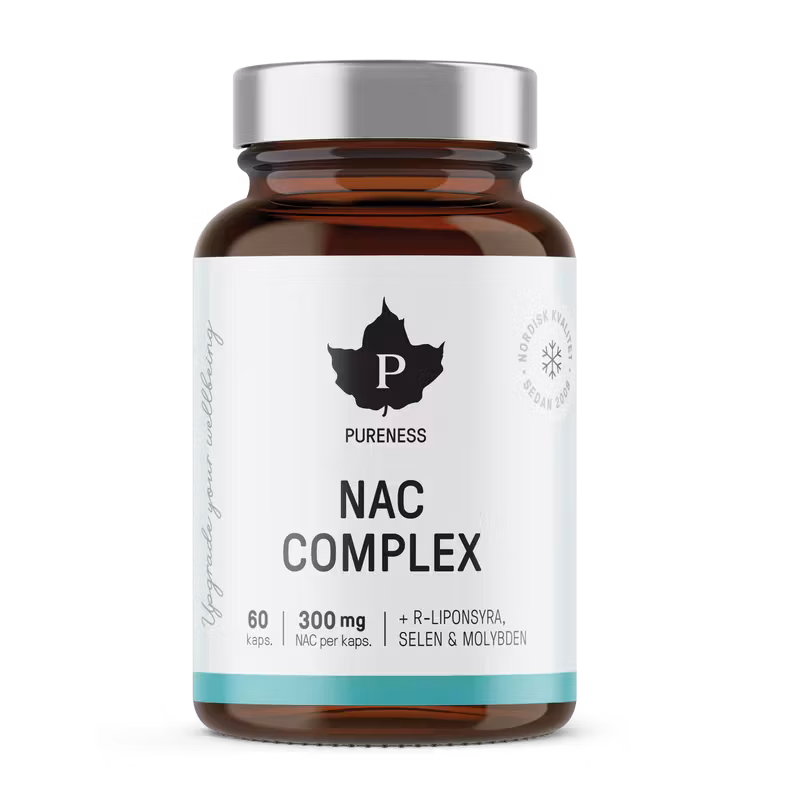 Pureness NAC Complex är ett högkvalitativt och heltäckande aminosyrapreparat som förutom N-acetyl-L-cystein (det som kallas NAC) även innehåller aktiv R-liponsyra, selen och molybden bland annat.