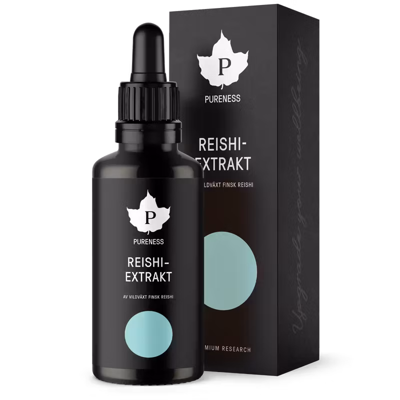 Pureness Reishi i extraktform – ett kosttillskott som framställs av finsk vildvuxen lackticka, eller Ganoderma lucidum på latin.