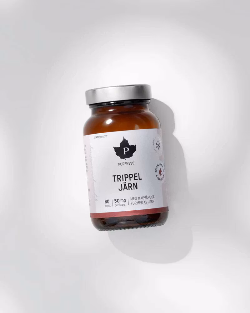 Pureness Trippel Järn är ett starkt och mångsidigt järntillskott utan onödiga tillsatser. Den är baserad på två högkvalitativa former av järn: järnbisglycinat och järnfumarat. Den tredje, unika komponenten i produkten är laktoferrin. Laktoferrin är ett glykoprotein som naturligt förekommer i kroppen och som inte bara innehåller en del järn i sig, utan också deltar i transporten av järn i kroppen. C-vitamin har också tillsatts produkten för att ytterligare förbättra järnupptaget. Genom att välja högkvalitativa ingredienser och eliminera användningen av tillsatser och fyllmedel, är produkten inte bara skonsam mot magen, utan absorberas också mycket väl.