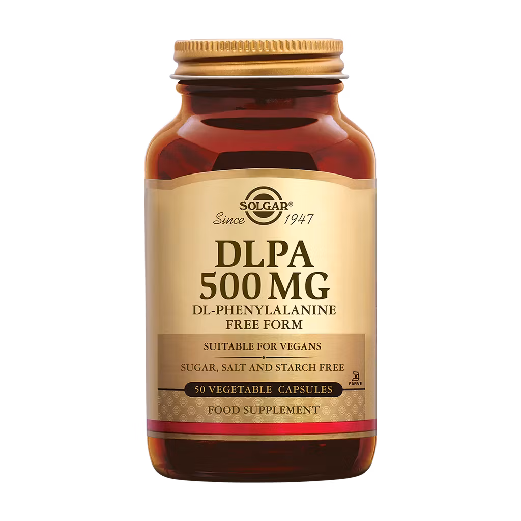 Solgar® DLPA 500 mg (DL-Phenylalanine) Vegetable Capsules innehåller DLPA, en blandning av den naturliga formen av fenylalanin (L-form) och dess spegelbild (D-f