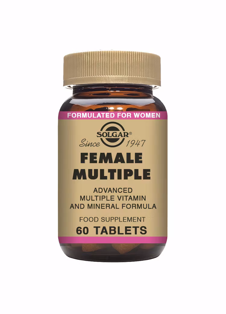 Solgar® Female Multiple är en unik skräddarsydd formula som tagits fram för att stärka kvinnors dagliga välmående. Den innehåller en avancerad kombination av vitaminer och mineraler, vilket innebär att du kan fortsätta ha en hektisk livsstil, utan att behöva oroa dig för att inte få alla de näringsämnen som du behöver; du får dem med tre tabletter om dagen.