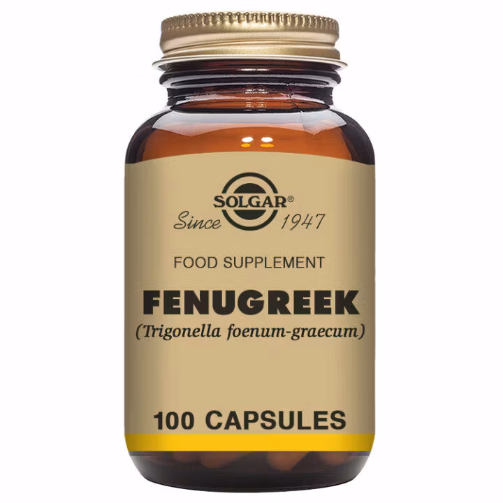 Solgar® Fenugreek Vegetable Capsules, som är lämpliga för veganer och vegetarianer, innehåller både extrakt och pulver från bockhornsklöverns fröer. 1 tablett om dagen tillför 150 mg extrakt och 370 mg pulver.