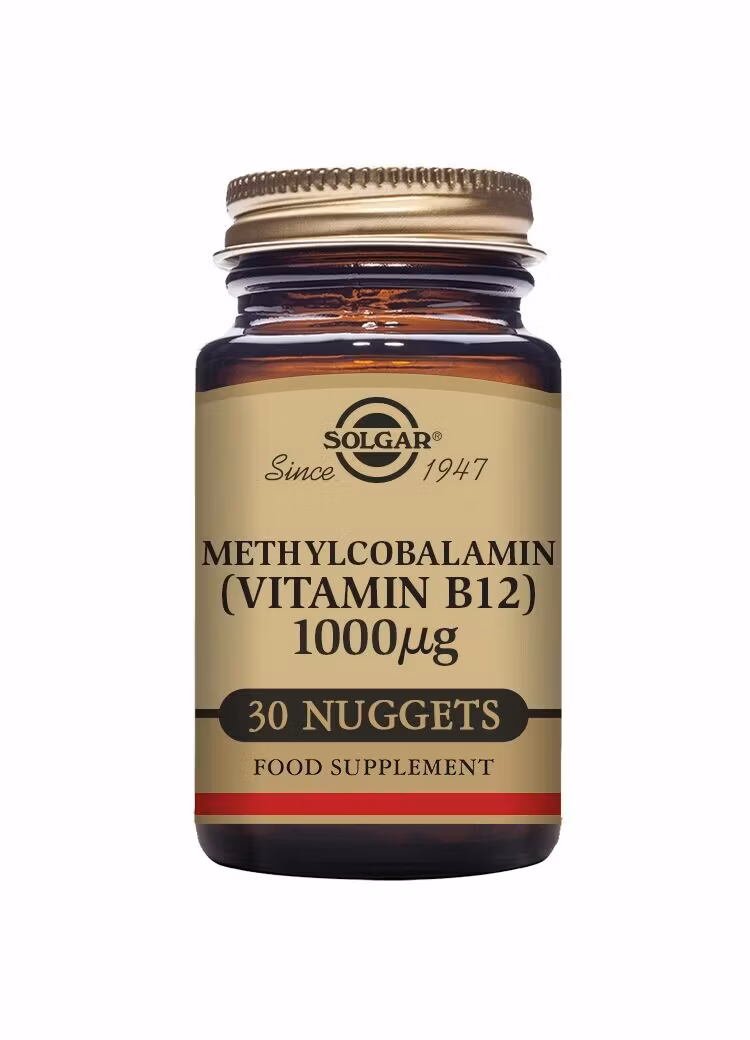 Den för kroppen färdiga Solgar® Methylcobalamin (vitamin B12) tabletter innehåller 1 000 μg av denna naturligt förekommande form av vitamin B12. Det spelar ett antal olika roller i kroppen, bl.a. att minska trötthet och bidra vid frisläppandet av energi som finns i livsmedel samt att stärka livskraften.