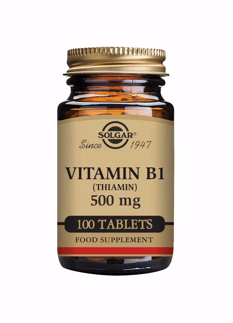 Solgar® Vitamin B1 (Tiamin) 500 mg innehåller vitamin B1, även känt som tiamin, i tablettform. Vitamin B1 är ett viktigt B-vitamin som bidrar till kroppens