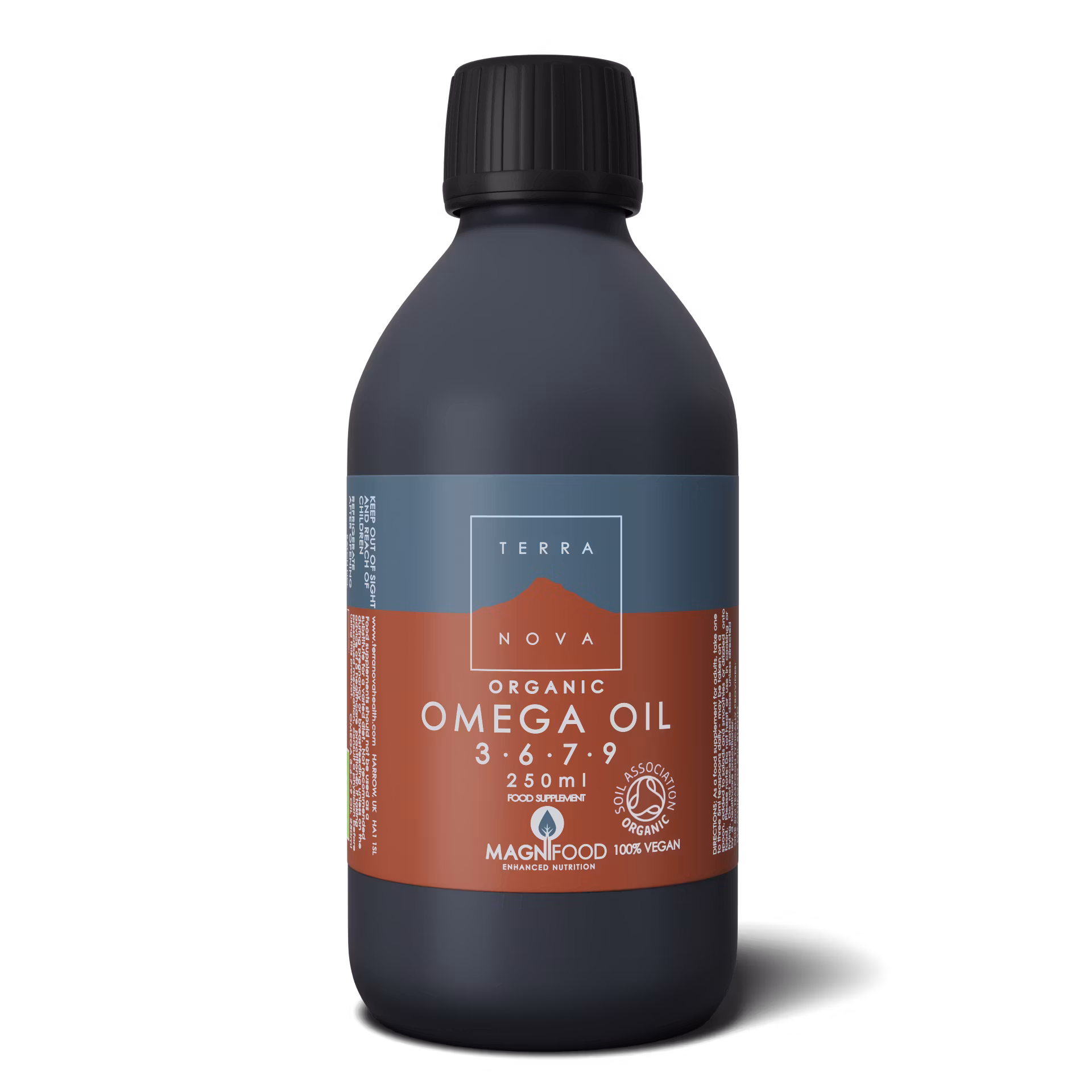 Certifierad ekologiskt fullspektrum omega olja! Ej från fisk utan från växtriket vilket medför att oljan är ren från början eftersom den kommer från det lägsta skiktet på näringskedjan. Därför behöver den aldrig genomgå en brutal reningsprocess från t.ex. tungmetaller som annars fiskolja behöver göra. Terranova’s fullspektrumprodukt med Omega-3, 6, (7) och 9 har dessutom den idealiska inbördes förhållandet mellan fettsyrorna, 2:1:1. Ekologisk linfröolja – Lin är särskilt rik på omega-3 fettsyror och alfa-linolensyra och är därför idealisk för att kompensera för maten som innehåller stora mängder omega-6-fettsyror, och som är ett problem i västvärlden. Ekologisk hampfröolja – Innesluten i hampafrön finns omättade/mättade fettsyror i perfekt förhållandet. Hampfröolja är en av de bästa vegetabiliska källor till omega-3-fettsyror. Den har dessutomen trevlig nötig smak, vilket bidrar till att den är omtyckt matlagning. Ekologisk olivolja – De flesta av fettsyrorna av olivolja är omega-9 mono-omättade fetter. Dess värde som en olja för hjärta är förmodligen på grund av det faktum att oljan är rik på polyfenol antioxidanter och av att det balanserar effekterna av omega-6-oljor utan att orsaka skador på omega-3 oljors hälsoeffekter. Ekologisk gurkörtsolja – Gurkörtsolja innehåller mest gamma-linolensyra (GLA), som är känd för att balansera de kvinnliga endokrina funktionerna. Det är också mycket bra för huden och har många andra hälsofördelar. Ekologisk riskli – Riskli är rik på antioxidanter och en mängd olika föreningar, såsom tokotrienoler, tokoferoler och gamma oryzanol. Ekologisk havtornsolja - Olja från dess frukt innehåller omega-7 fettsyran, som har blivit mycket populärt i hälso- och skönhetsprodukter. Oljan innehåller också stora mängder polyfenoliska antioxidanter.