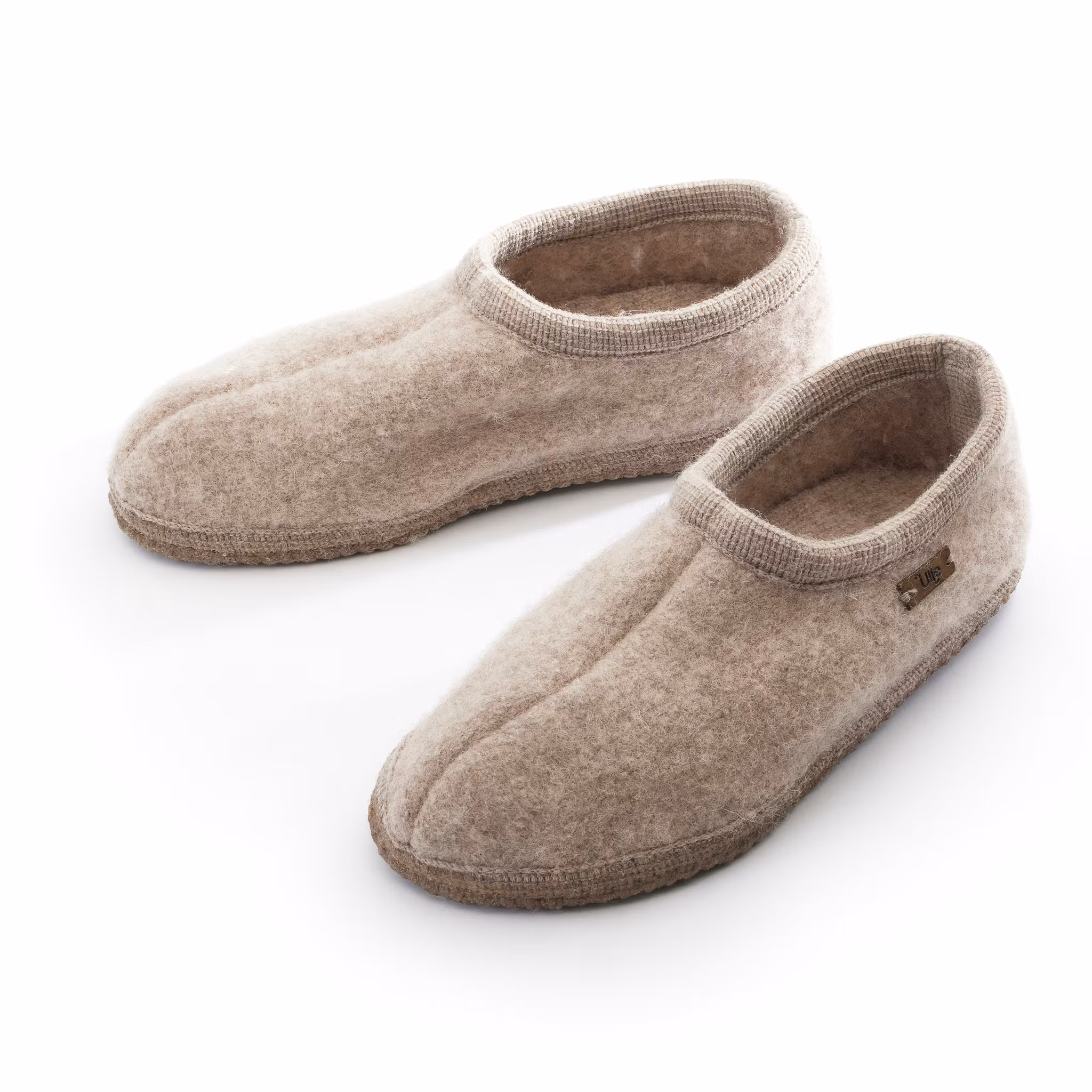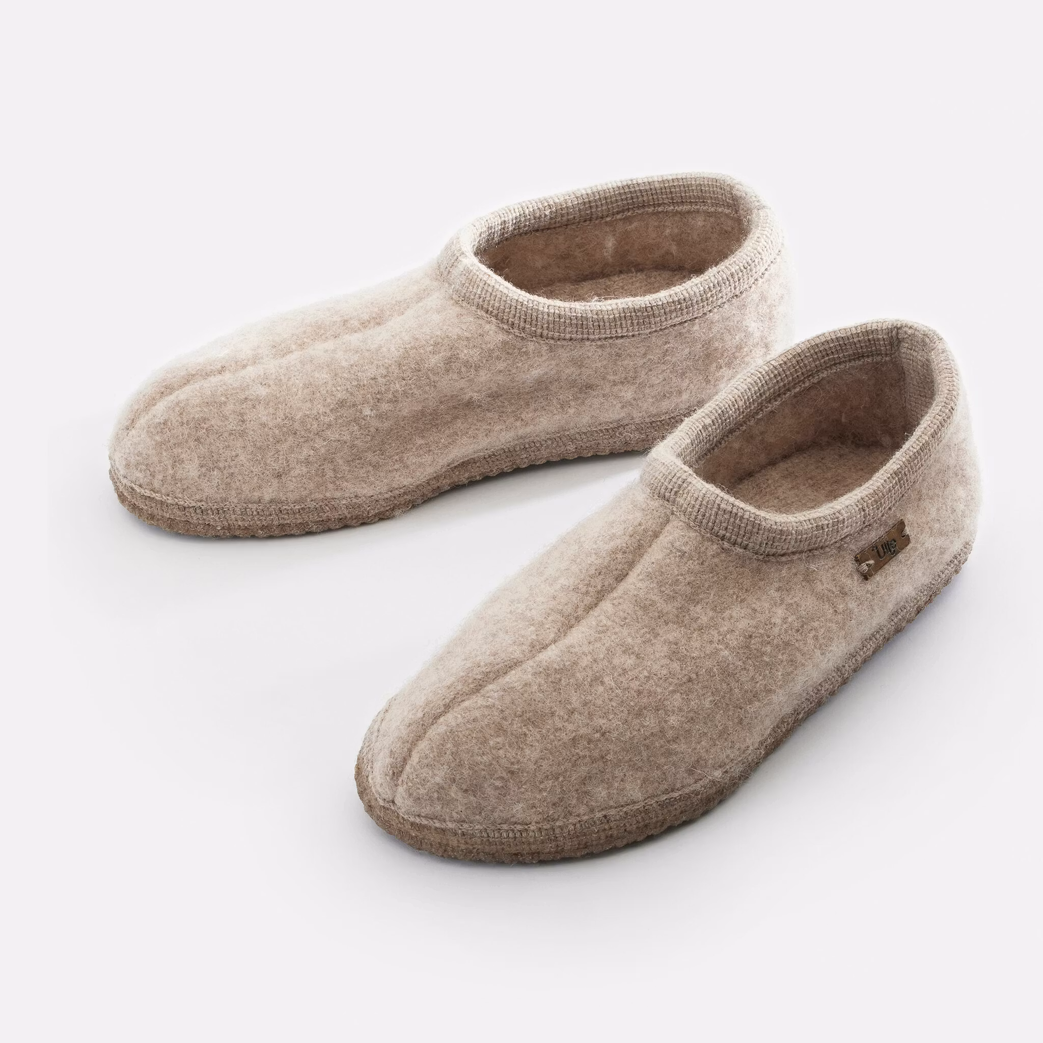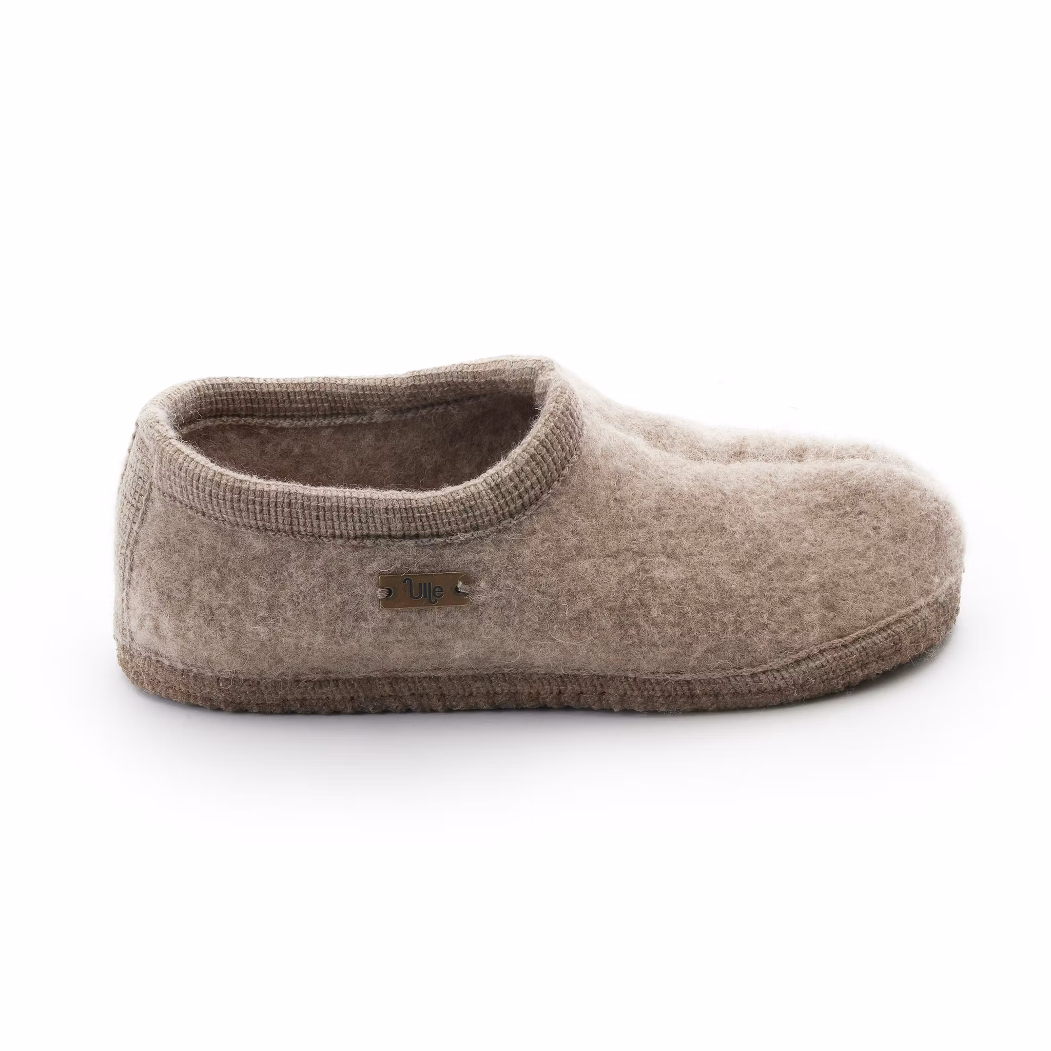Det högkvalitativa ullgarnet är grunden till Ulles kvalitet. Garnet som används i tillverkningen är tvättat, stickat och tovat. När det stickade ullgarnet tumlas komprimeras materialet till en tät struktur. Tyget, som är mjukt och elastiskt, anpassar sig perfekt till foten för ett behagligt steg.