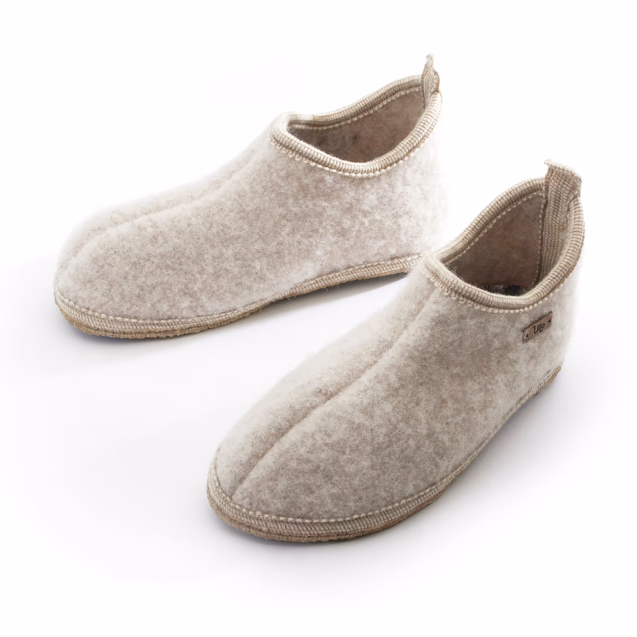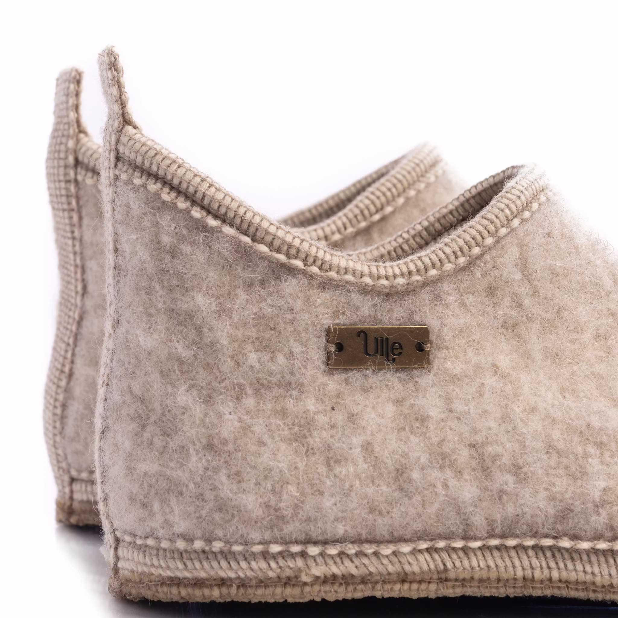 Det högkvalitativa ullgarnet är grunden till Ulles kvalitet. Garnet som används i tillverkningen är tvättat, stickat och tovat. När det stickade ullgarnet tumlas komprimeras materialet till en tät struktur. Tyget, som är mjukt och elastiskt, anpassar sig perfekt till foten för ett behagligt steg.