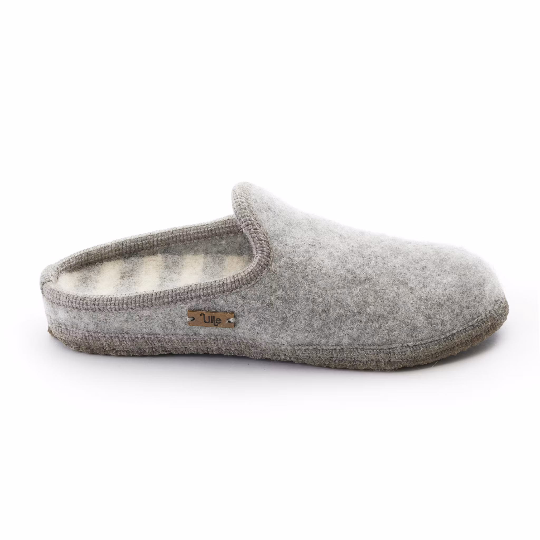 Det högkvalitativa ullgarnet är grunden till Ulles kvalitet. Garnet som används i tillverkningen är tvättat, stickat och tovat. När det stickade ullgarnet tumlas komprimeras materialet till en tät struktur. Tyget, som är mjukt och elastiskt, anpassar sig perfekt till foten för ett behagligt steg.