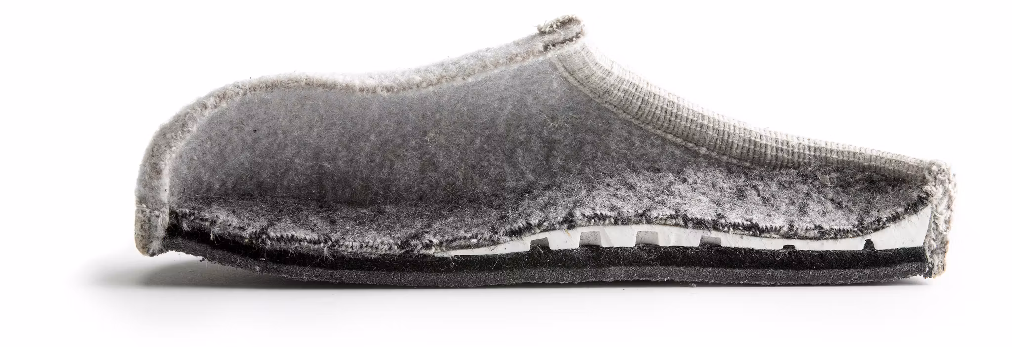 Det högkvalitativa ullgarnet är grunden till Ulles kvalitet. Garnet som används i tillverkningen är tvättat, stickat och tovat. När det stickade ullgarnet tumlas komprimeras materialet till en tät struktur. Tyget, som är mjukt och elastiskt, anpassar sig perfekt till foten för ett behagligt steg.