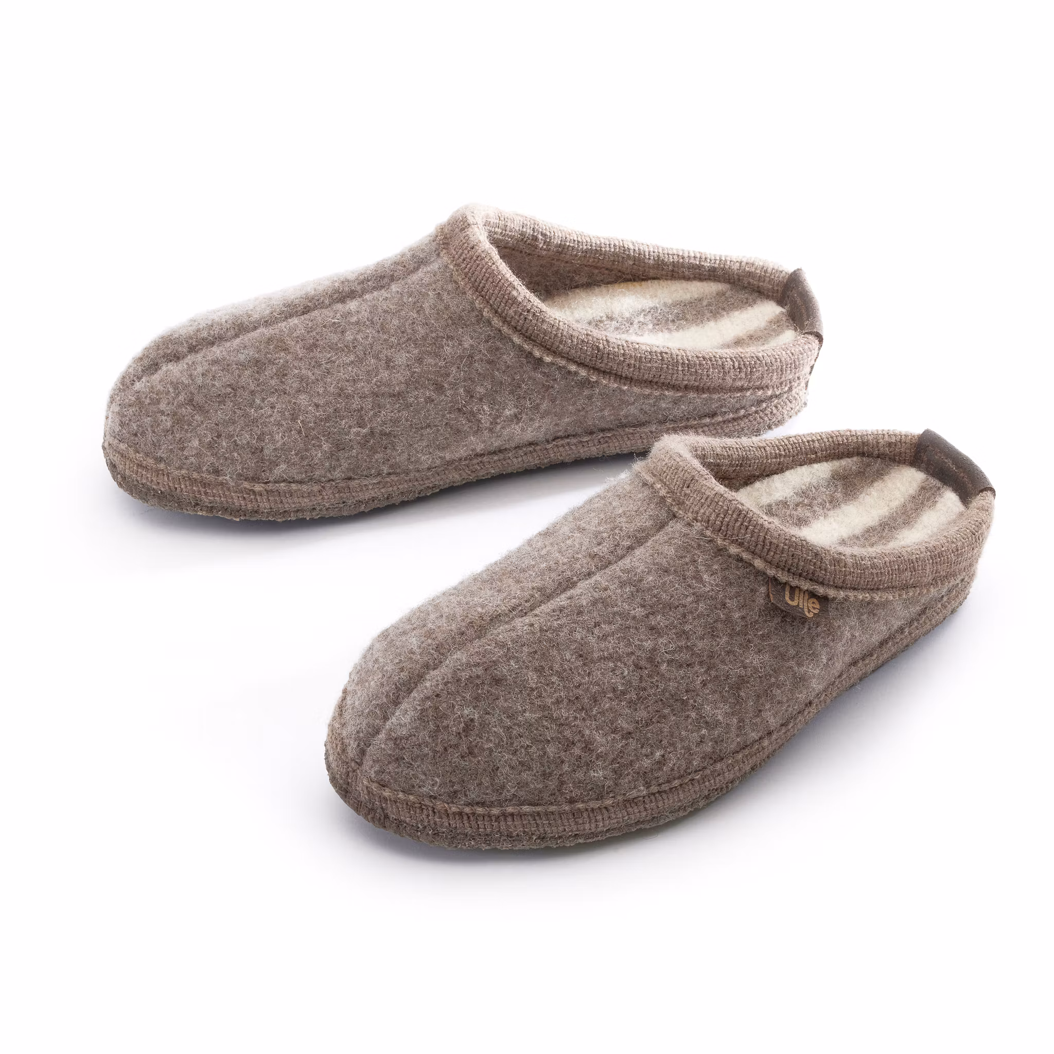 Ulltofflor i 100% ren ull med en klassisk design och randig innersula. Tofflorna kombinerar komfort och kvalitet med sitt naturmaterial och ortopediskt uppbyggda sula som ger stöd i häl och hålfot. Ulltofflorna formar sig efter foten, ger ergonomiskt stöd och håller en behaglig temperatur året om. Med halkfri sula och naturligt antibakteriella egenskaper är de både praktiska och bekväma.
